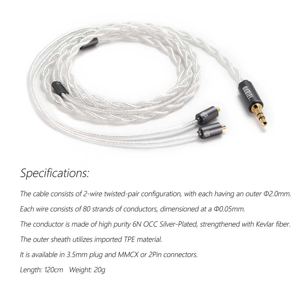 The ddHiFi BC120A (Clouds) is a silver-plated copper cable specifically designed for audiophile in-ear monitor users. Lightweight and durable, this premium cable consists of 80 strands of OCC 6N copper, meticulously silver-plated. All 160 strands (80 per cable) are then reinforced with Kevlar for maximum durability and finally sheathed in a TPE jacket for noise reduction.